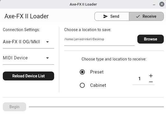 While Wine sort of worked, let's just say it was a poor experience. Also, a change to fxload meant that the udev rules installer script for the USB firmware had to be fixed. I realised that lot of the time I'm happy driving the unit from the front panel, and all I really wanted was a way to do the things that can't be done through that interface, which is only really loading/exporting files (which was broken when using Axe-Edit in Wine). A fair amount of the Axe-FX sysex messages are documented, so I decided that this is a doable thing.
