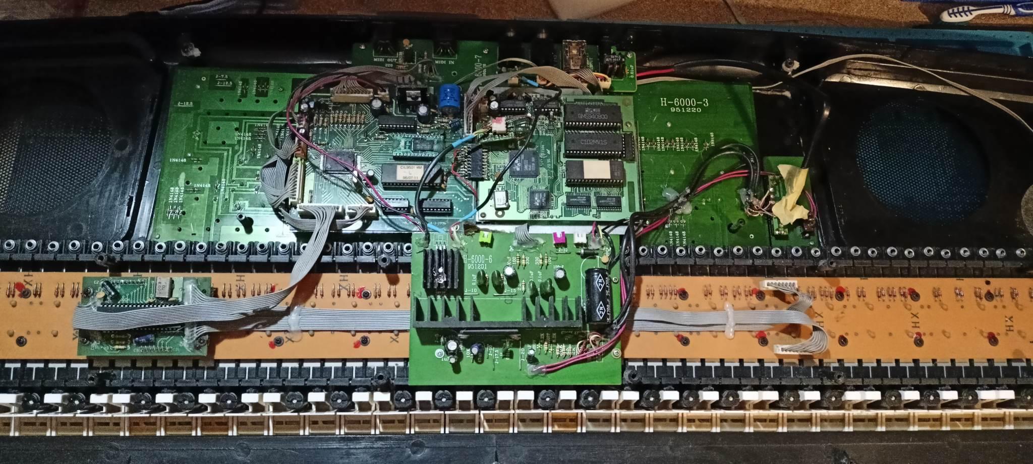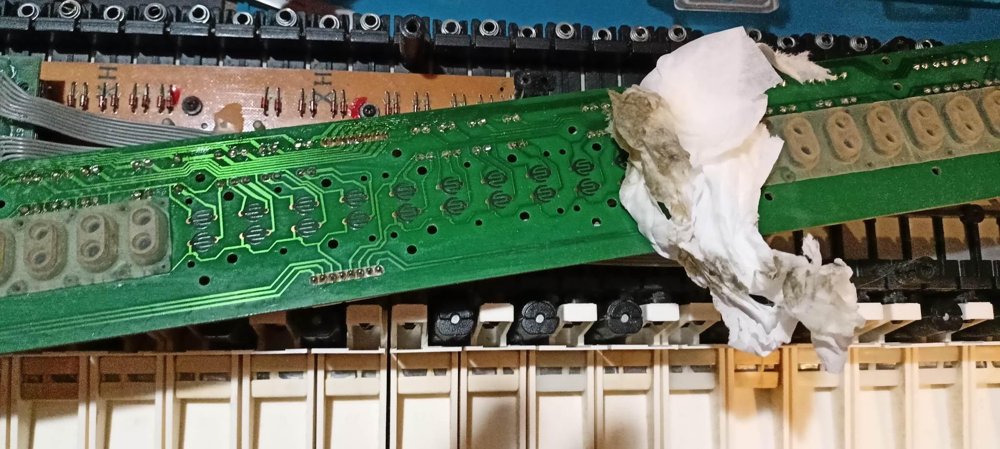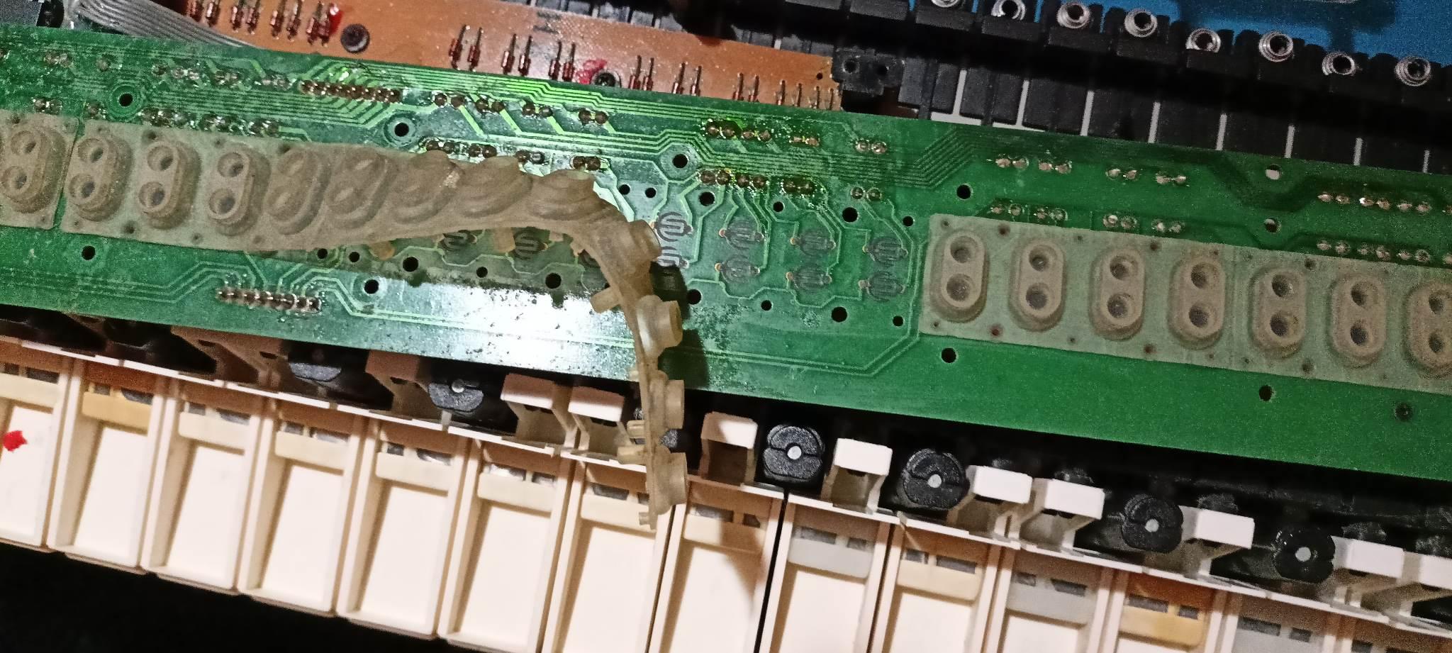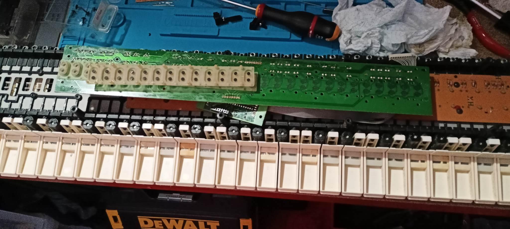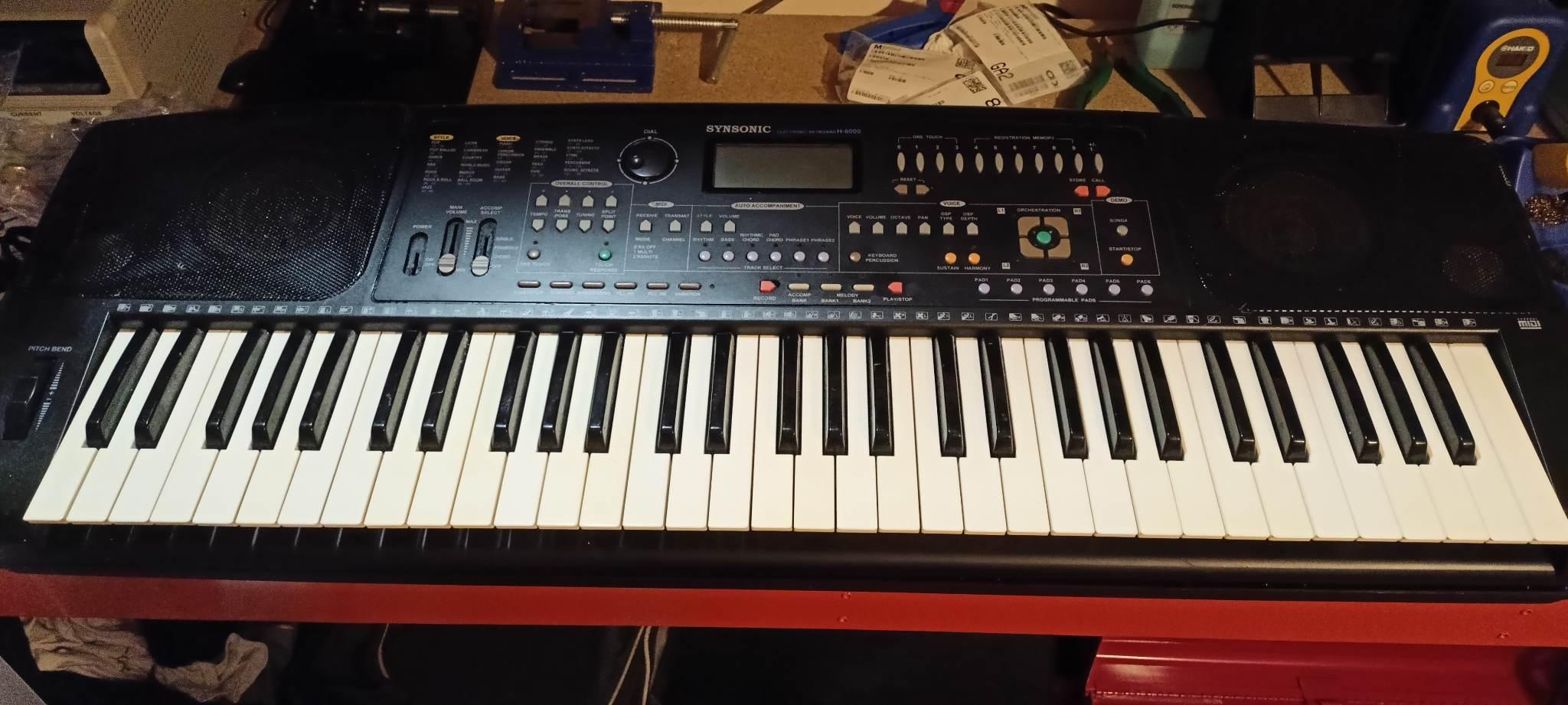 Some pictures of a keyboard that I repaired. Initially it wouldn't turn on, turns out that the wiring to the power supply board was done very badly - they had been hot melt glued and had zero solder! After that I found the keys were a bit sticky and the velocity aspect didn't work right, so a clean up job ensued. It works great now!